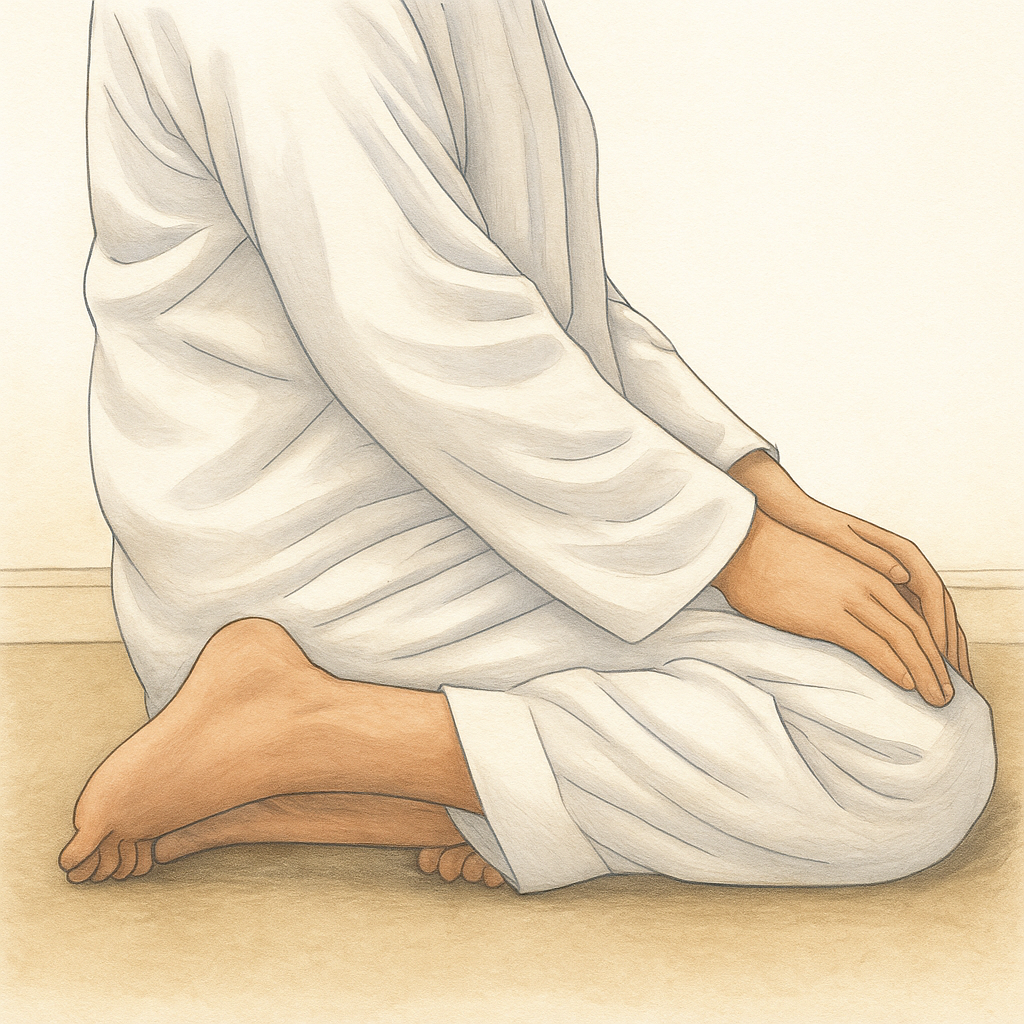 7/ On relève une première fois la tête en prononçant le Takbir tout en restant assis au sol. De préférence, on étend son pied gauche sur le sol (sous soi) de manière à s’asseoir dessus, [la jambe droite repliée], le pied droit relevé, et on pose les mains sur les cuisses et les genoux. (voir photos ci-dessous).
