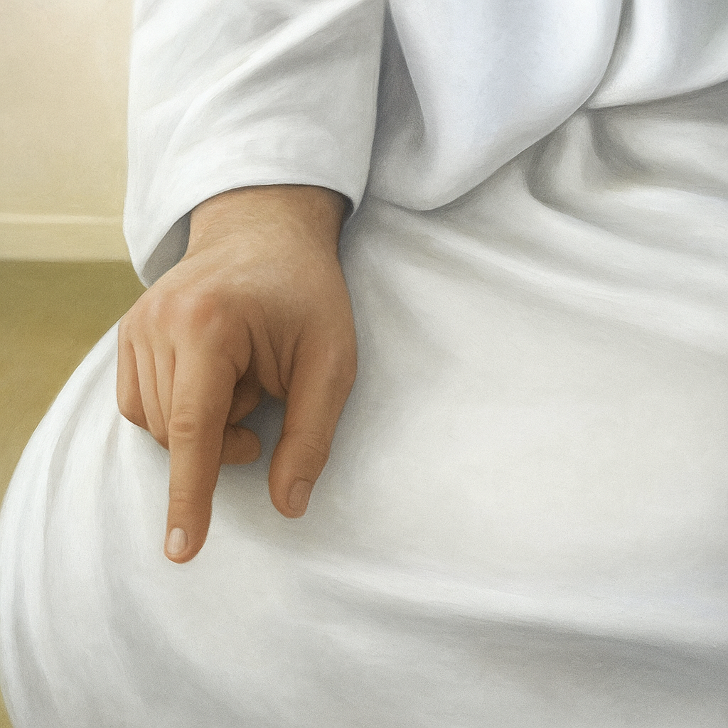 On pose la main droite sur la cuisse droite, en serrant le poing sauf l’index que l’on pointe vers l’avant, lorsque l’on mentionne le nom d’Allah, dans la formule du Tawhid et les invocations.