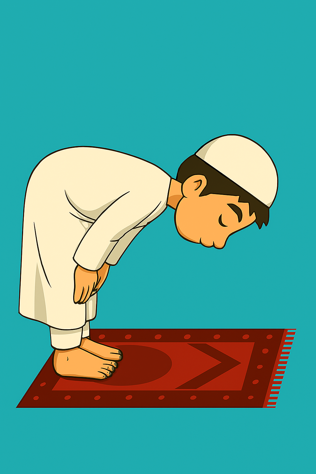 Une fois incliné Il faut que la tête soit dans le prolongement du dos, les mains sur les genoux, les doigts écartés en disant : « Gloire et pureté à mon Seigneur le Très Grand » –Soubhana Rabbi al-Adhim – سُبْحَانَ رَبِّيَ الْعَظِيمِ –