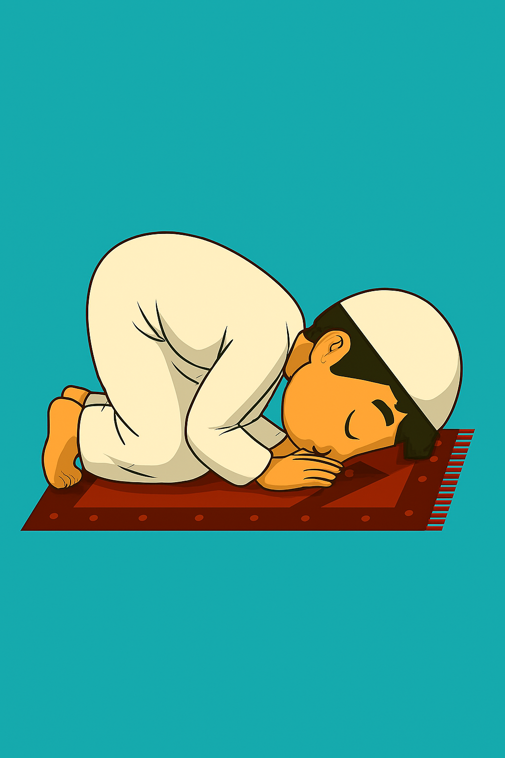6/ Puis on se prosterne en prononçant le Takbir [Allahou Akbar]. Les 7 membres suivants doivent toucher le sol : le front et le nez, les mains, les genoux, la plante des pieds et les orteils repliés. (voir photos ci-dessus)